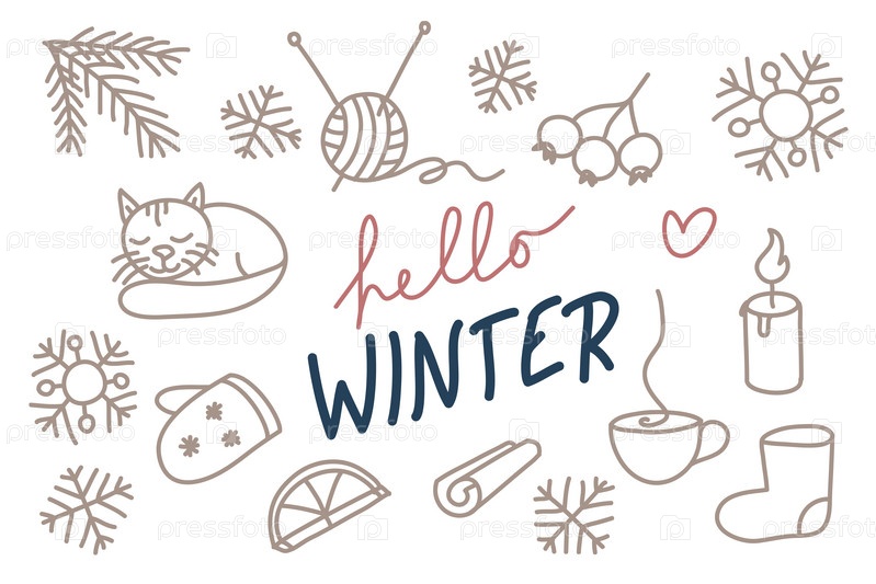 Привет зимний набор иконок с уютным чаем, лимоном, свечой, рождественской елкой, снежинкой