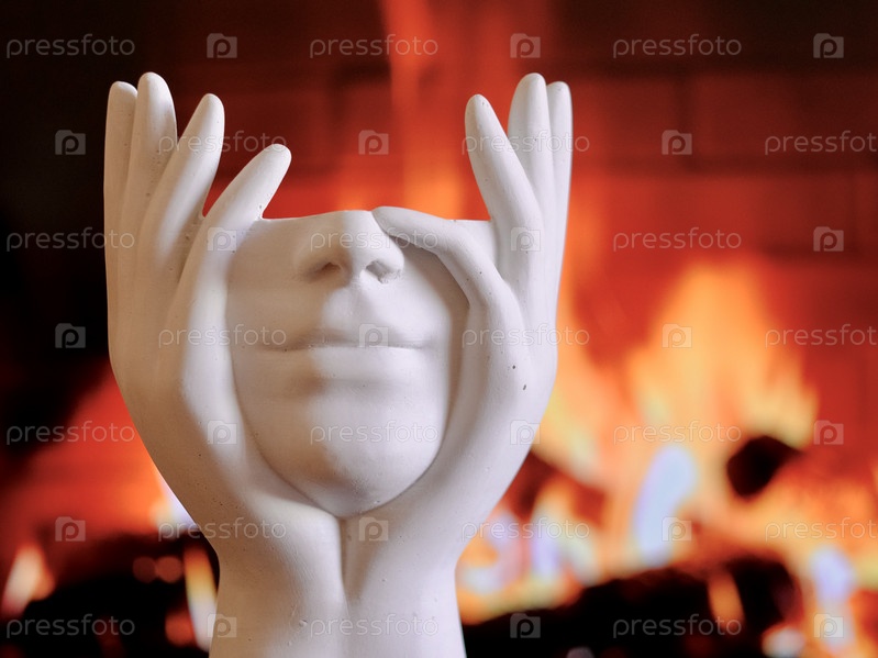 Фон горящего камина белая гипсовая статуэтка без головы