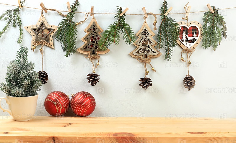 Пустой деревенский стол с живой елкой в кружке, сосновыми шишками, корицей, кухонной утварью и самодельными деревянными украшениями. Рождественский и новогодний эко-макет для дизайна и демонстрации продукции, концепция нулевых отходов, выборочный фокус