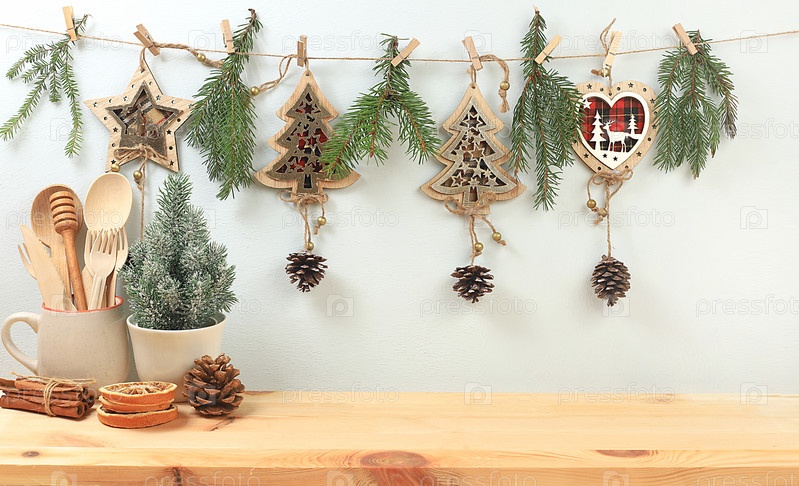 Пустой деревенский стол с живой елкой в кружке, сосновыми шишками, корицей, кухонной утварью и самодельными деревянными украшениями. Рождественский и новогодний эко-макет для дизайна и демонстрации продукции, концепция нулевых отходов, выборочный фокус