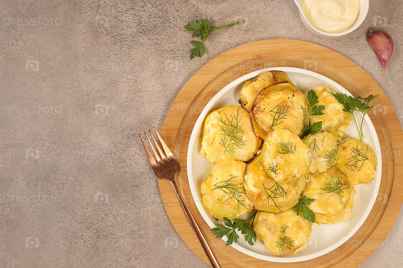 Жареные овощные кабачки в кляре с чесночным соусом и специями на бетонном столе, органические натуральные кабачки на гриле, здоровый завтрак с ингредиентами, концепция похудания и похудения, выборочный фокус