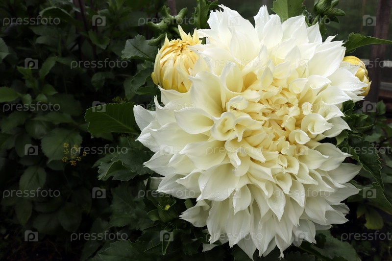 Белоснежный марговый георгин (лат. Dahlia) на фоне темных листьев