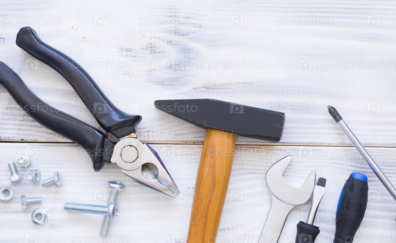 Многие разные инструменты на белом деревянном фоне