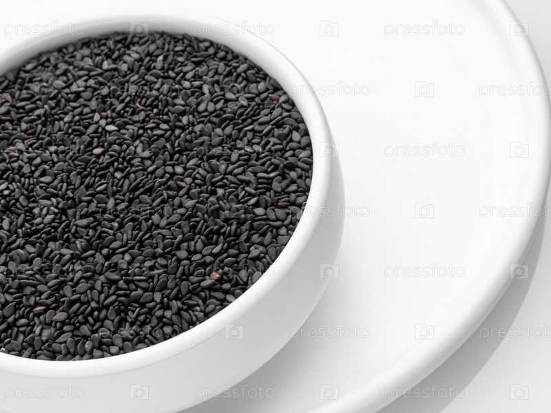 Семена черного кунжута в белой миске на белом подносе на белом фоне. Горизонтальный. Селективный фокус. Крупный план. наклон