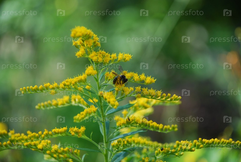 Желтый цветок золотарника канадского с осой