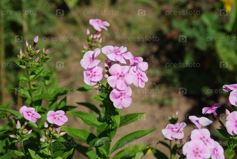 Флоксы нежно-розового цвета. На тонких высоких длинных стеблях растут бледно-розовые мелкие цветки с пятью лепестками. Часть цветков еще закрыты в бутонах, часть уже распустилась