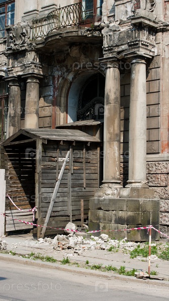 Сломанная входная дверь старого заброшенного дома. центр города Калининграда -здание по адресу Сергея Тюленина 15-21.Здание в стиле барокко.ремонт исторического здания банка «Восточно-Прусский ландшафт»