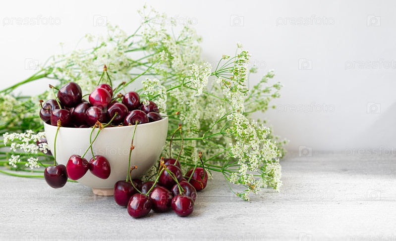 Спелая черешня в керамической миске