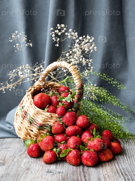 Натюрморт с клубникой, высыпающейся из корзины