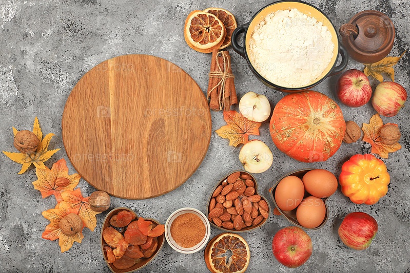 Кухонный фон с тыквой, яблоками, специями, орехами, мукой, яйцами с местом для меню, концепцией приготовления, ингредиентами для рецепта тыквенных и яблочных пирогов, выборочным фокусом, видом сверху, местом для текста,