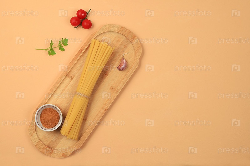 Кухонный фон с ингредиентами для рецепта приготовления спагетти, минимальная концепция приготовления, традиционная итальянская кухня, визитная карточка для ресторана, кафе, магазина, меню, выборочный фокус, вид сверху,