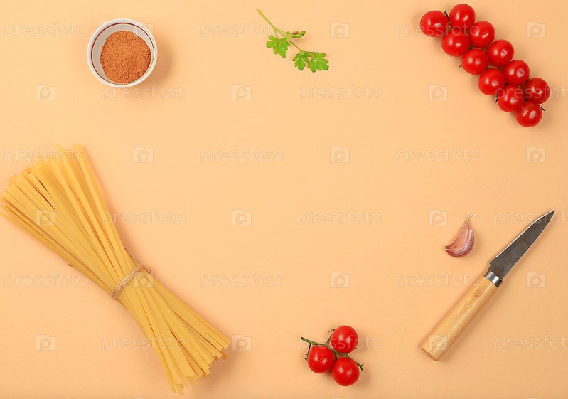 Кухонный фон с ингредиентами для рецепта приготовления спагетти, минимальная концепция приготовления, традиционная итальянская кухня, визитная карточка для ресторана, кафе, магазина, меню, выборочный фокус, вид сверху,