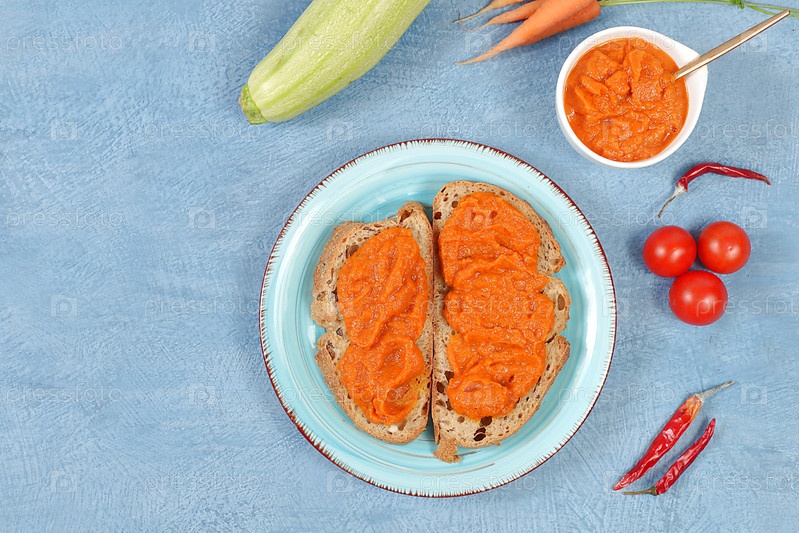 Сэндвич с зерновым хлебом и тыквенной икрой на бетонном фоне, здоровый завтрак с ингредиентами, концепция здорового питания, место для текста,