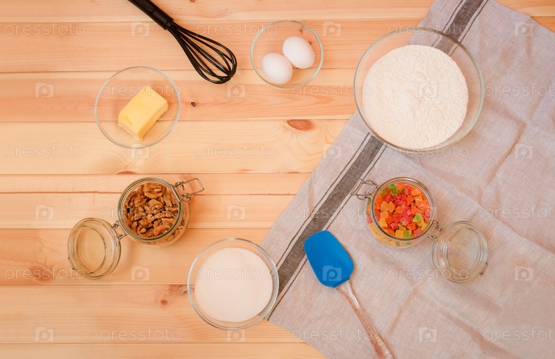 Ингредиенты для выпечки, венчик и лопаточка на деревянном фоне. Вид сверху, пространство для копирования