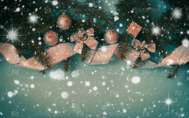 Рождественская граница из еловых веток, ленты, украшений и подарков на синем фоне