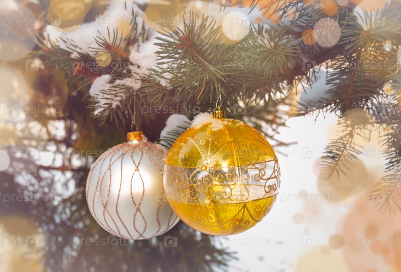Желтые и белые елочные шары висят на ветке дерева. Селективный фокус на желтом шаре