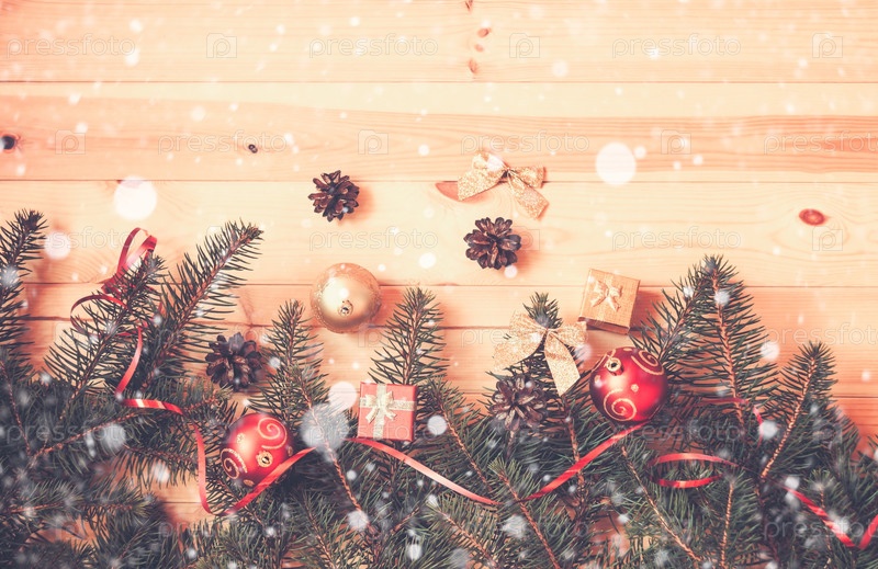 Рождественская граница из еловых веток, украшений и подарков. Винтажный стиль. Вид сверху