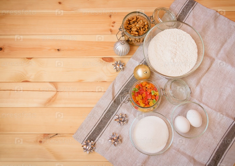 Ингредиенты для выпечки рождественского торта и рождественских украшений на деревянном фоне. Вид сверху, пространство для копирования