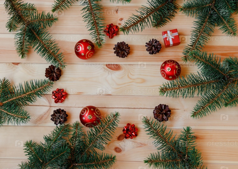 Рождественская рамка из еловых веток, сосновых шишек, подарочных бантов и красных шаров. Плоская планировка, вид сверху