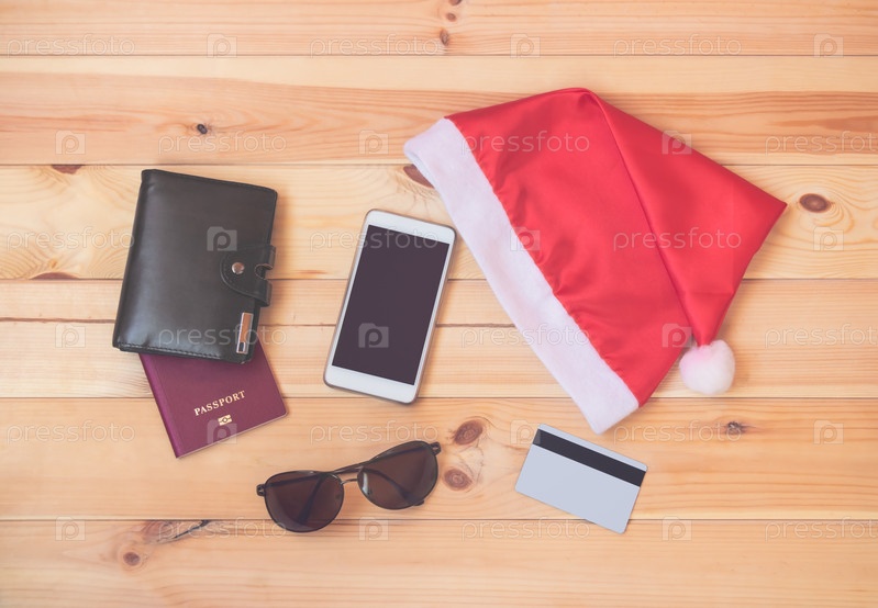 Набор вещей для праздников и шапка Деда Мороза. Концепция рождественского путешествия
