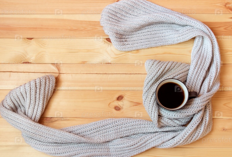 Кружка горячего кофе и шарф на деревянном фоне. Вид сверху, пространство для копирования