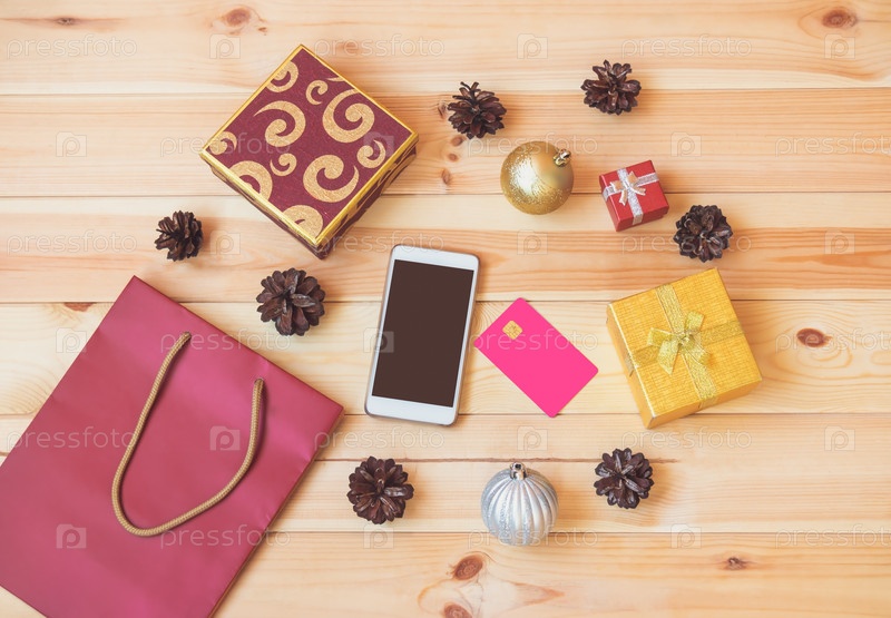 Смартфон, хозяйственная сумка, кредитная карта, рождественские украшения и подарочные коробки на деревянном фоне. Концепция рождественских покупок