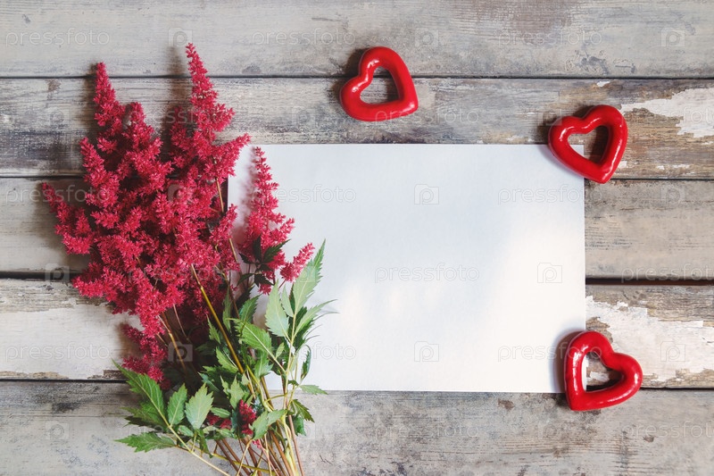 Красивые цветы астильбы, пустая открытка для текста и красные сердечки на старом деревянном фоне. Вид сверху с местом для копирования