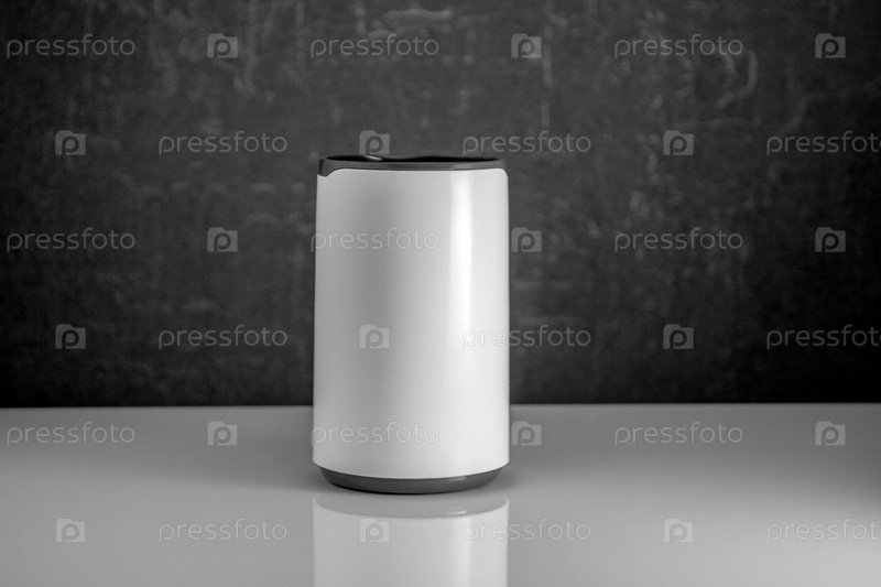 Крупный план электрической кофемолки на белом столе на сером фоне