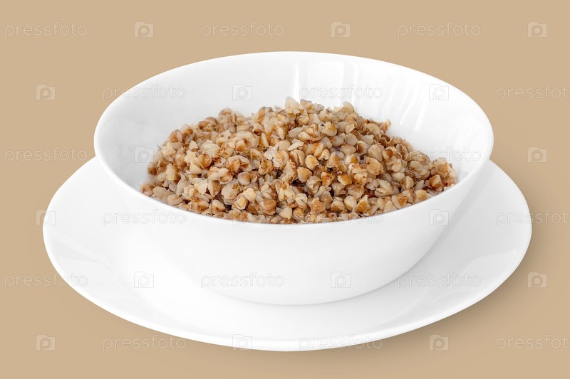 Глубокая белая тарелка с вареной гречкой на белом блюдце