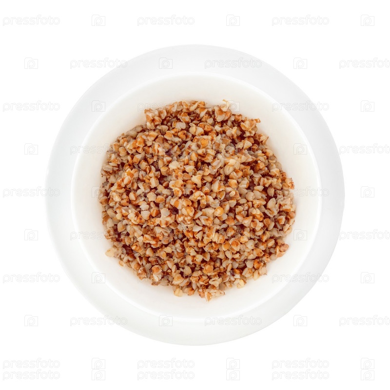 Глубокая белая тарелка на блюдце с вареной гречкой