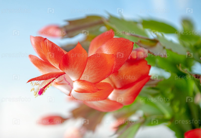 Ярко-красный цветок Шлюмберже крупным планом на размытом синем фоне