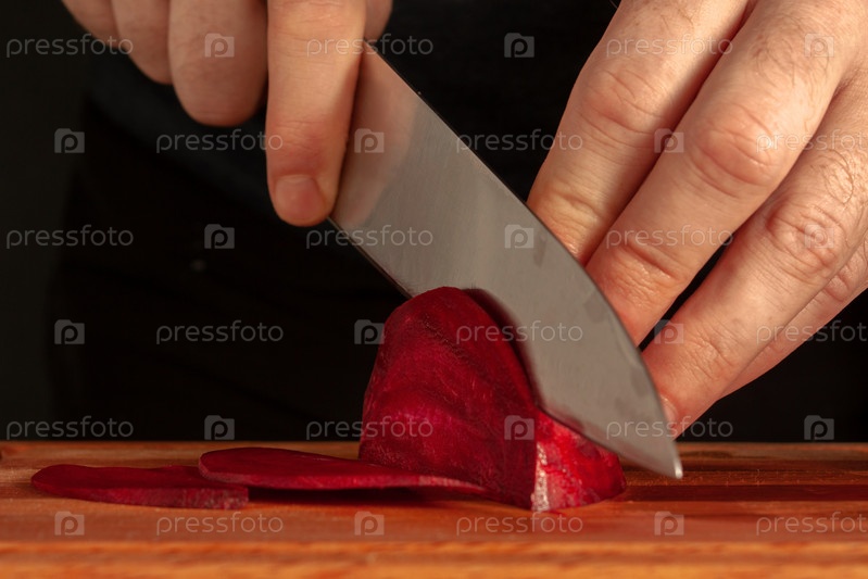 Мужские руки нарезают поварским ножом свежую свеклу на разделочной доске