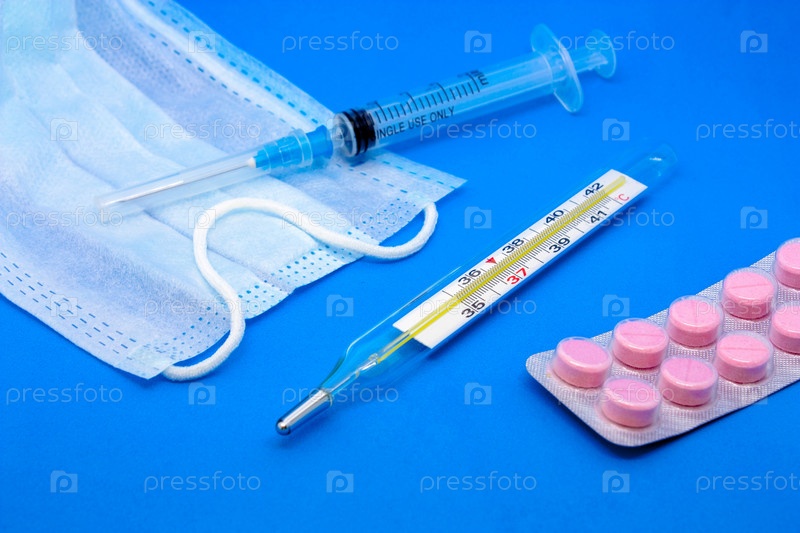 Одноразовый шприц, медицинская маска, ртутный термометр и таблетки от лихорадки на синем фоне