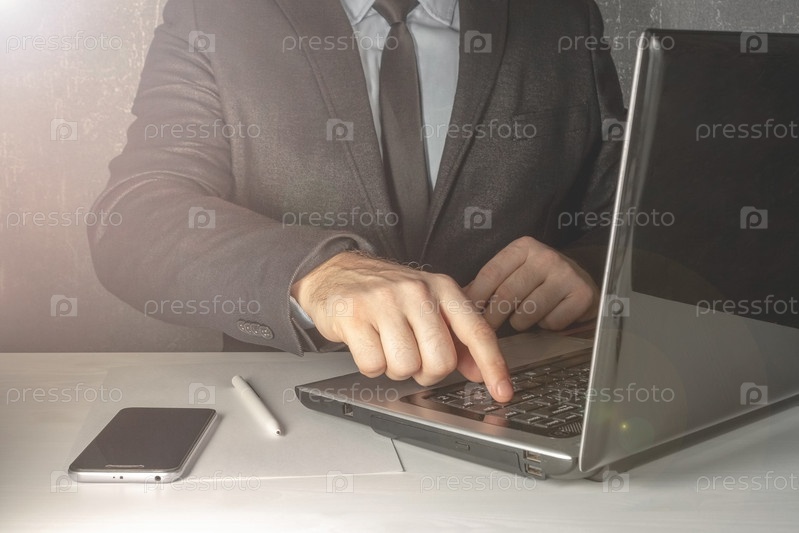 Мужчина-бизнесмен в костюме с галстуком работает за ноутбуком на столе с листом бумаги, ручкой и смартфоном в лучах яркого солнца из окна. Блики на крышке компьютера