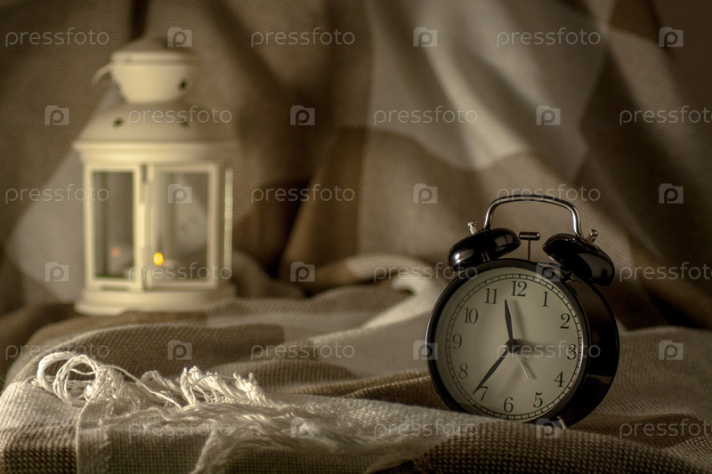 Будильник и лампа с горящей свечой на заднем плане, размытые на фоне клетчатой клетки в теплых тонах с избирательным фокусом