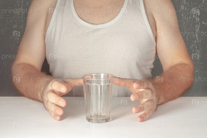 Одинокий мужчина, алкоголик без лица в белой футболке, сидит за столом и тянется к пустому граненому стакану