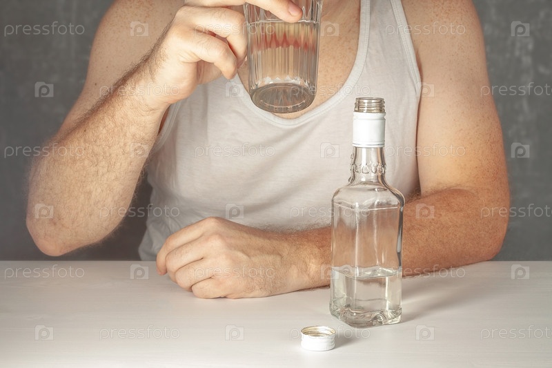 Одинокий мужчина, алкоголик без лица в белой футболке сидит за столом и пьет водку из граненого стакана