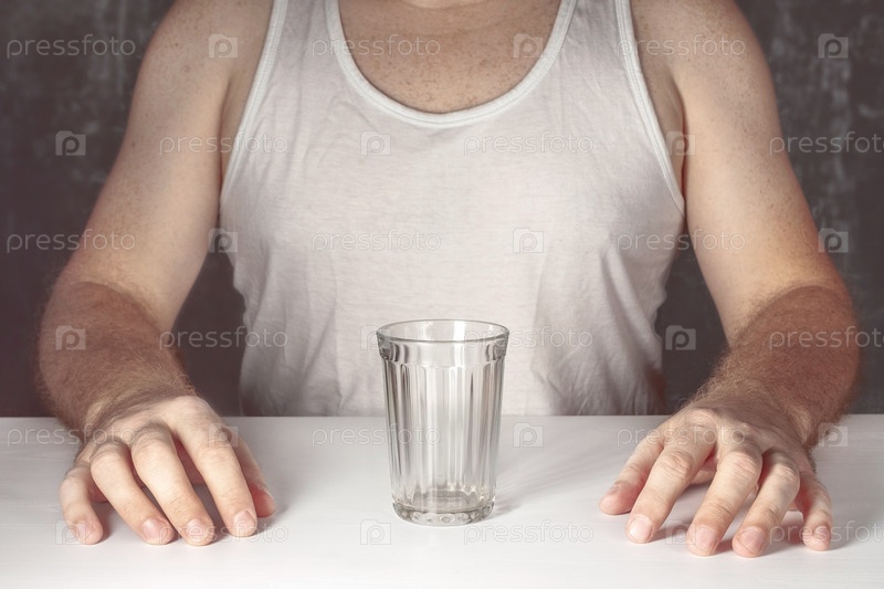 Мужчина без лица сидит за столом в футболке алкоголика перед пустым граненым стаканом в надежде получить дозу алкоголя