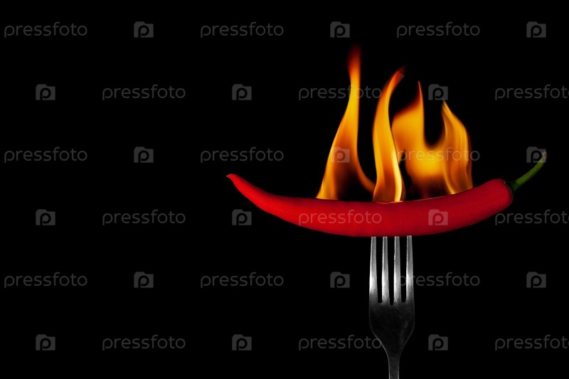 Крупный план красного острого перца, горящего в огне на столовой вилке на черном фоне