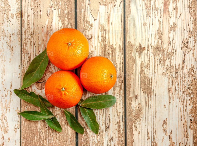 Вид сверху на три спелых мандарина на деревянном фоне рядом с зелеными листьями