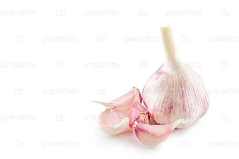 Головка молодого чеснока и несколько зубчиков чеснока на белом фоне