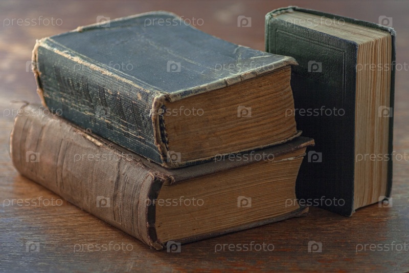 На старом потрепанном деревянном столе сложены три старые потрепанные книги