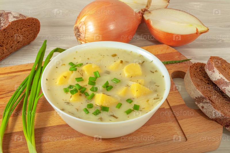 Белая тарелка сырно-картофельного лукового супа в окружении ломтиков ржаного хлеба, зеленого лука и репчатого лука