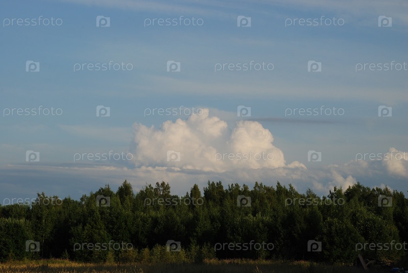 Лиственный зеленый лес и облака