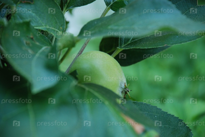 Фрукты на ветке дерева. Среди темно-зеленых овальных листьев яблони выросло и созревает светло-зеленое округлое яблоко. Листья частично скрывают от зрителя плоды