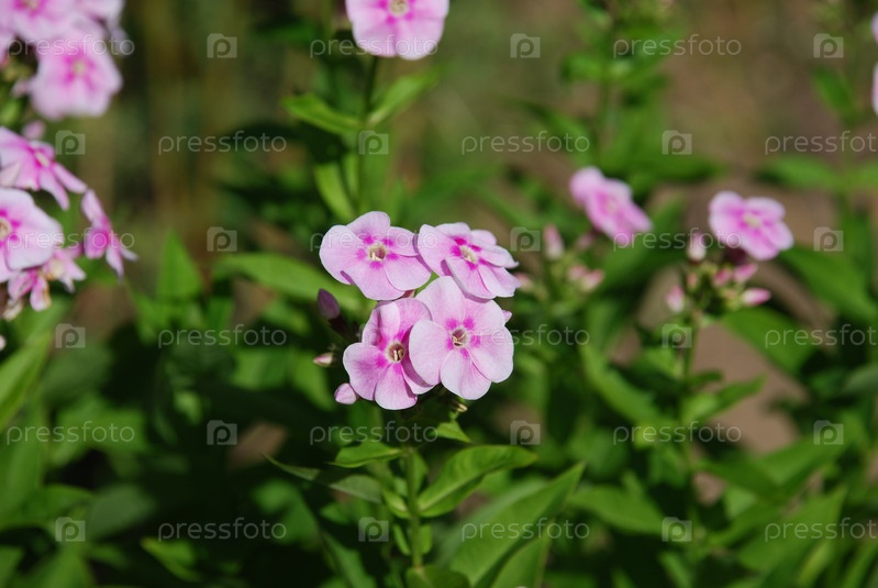 Флоксы нежно-розового цвета. На тонких высоких длинных стеблях растут бледно-розовые мелкие цветки с пятью лепестками. Часть цветков еще закрыты в бутонах, часть уже распустилась