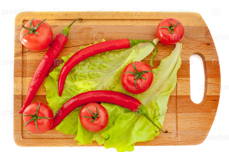 Вид сверху на помидоры, красный перец, салат на разделочной доске
