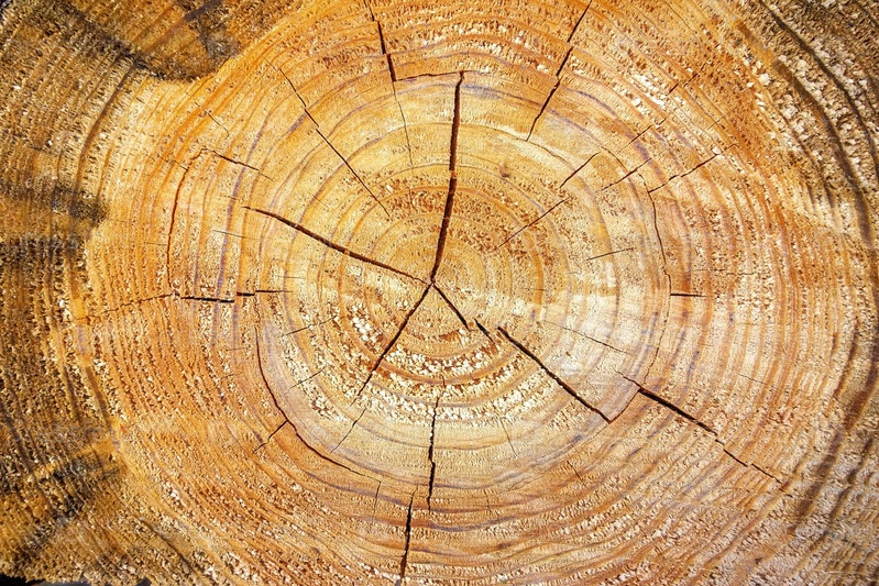 Треснутый распил ствола сосны с годовыми кольцами