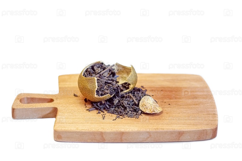 Китайский чай шэн пуэр в сломанном сушеном мандарине крупным планом на разделочной доске на белом фоне. Селективный фокус