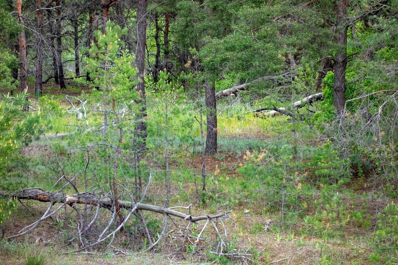 Весенний смешанный лес. Поваленные деревья на фоне высоких сосен